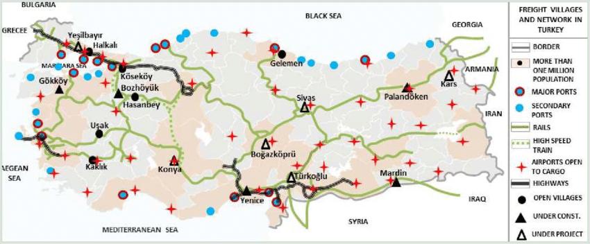 Debido a su posición geográfica única, la mejora del transporte es una prioridad para el desarrollo económico y social de Turquía. En los últimos años, Turquía ha realizado importantes inversiones y disposiciones legales para mejorar y diversificar su transporte nacional e internacional. El transporte aéreo es un componente fundamental del turismo turco, ya que proporciona el enlace vital entre las zonas generadoras de turismo y los destinos en Turquía, como se puede ver en el mapa de transporte de Turquía. En 2010, el 68,3% de los extranjeros que llegaron a Turquía prefirieron el transporte aéreo como medio de transporte. A partir de 1950, el transporte por carretera ha experimentado un importante proceso de desarrollo y ahora se considera el modo de transporte dominante en Turquía.